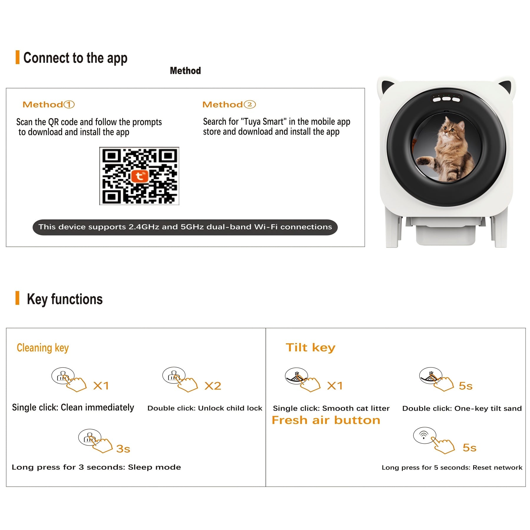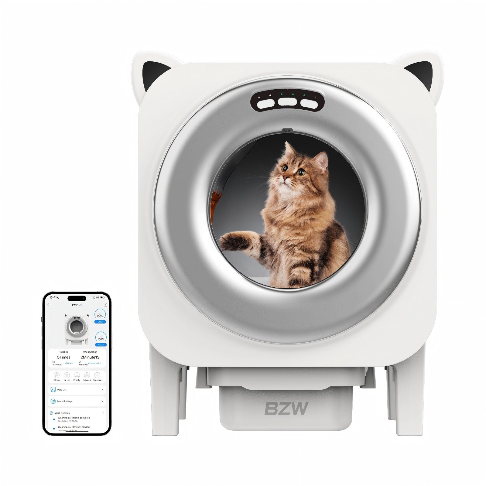 SMART APP CONTROL: Remote Management at Your Fingertips. Use the app to start cleaning, schedule waste disposal, and monitor litter usage trends. Get real-time alerts when the bin is full. Supports both 2.4GHz and 5GHz WiFi for stable, uninterrupted connection.