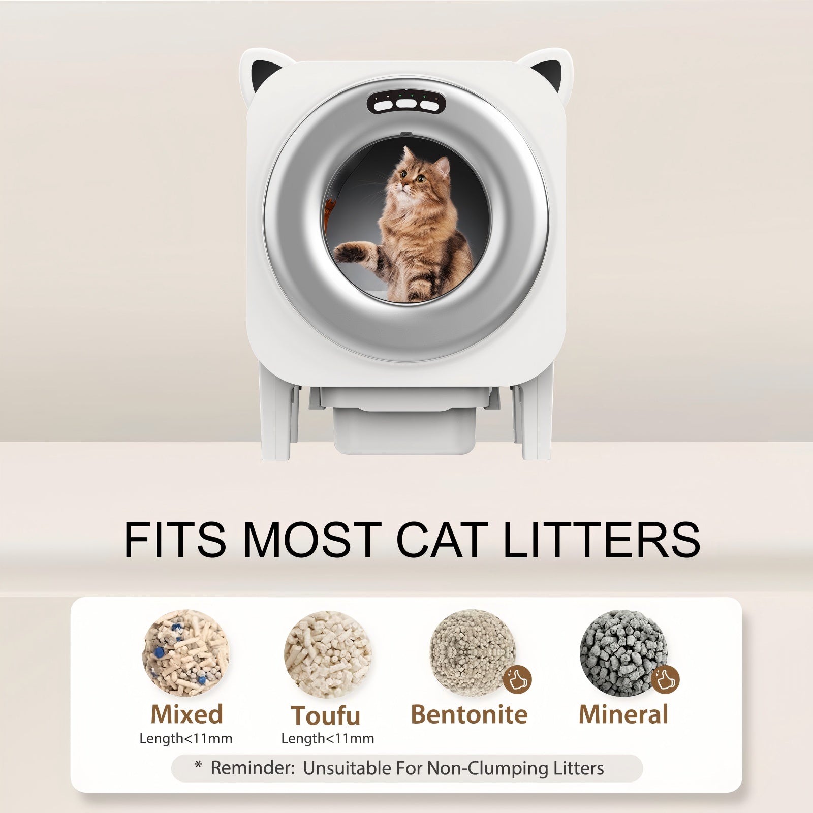 UPGRADED EXTRA-LARGE SPACE: Roomy Design for Multi-Cat Homes. A 75L litter drum supports two or more cats, while an 11L sealed waste bin holds up to 15 days of waste—perfect for busy lifestyles or travel. Spacious enough for cats weighing 3.3–29.9 lbs to move, stretch, and relax comfortably. Compatible with most clumping and silica litters.
